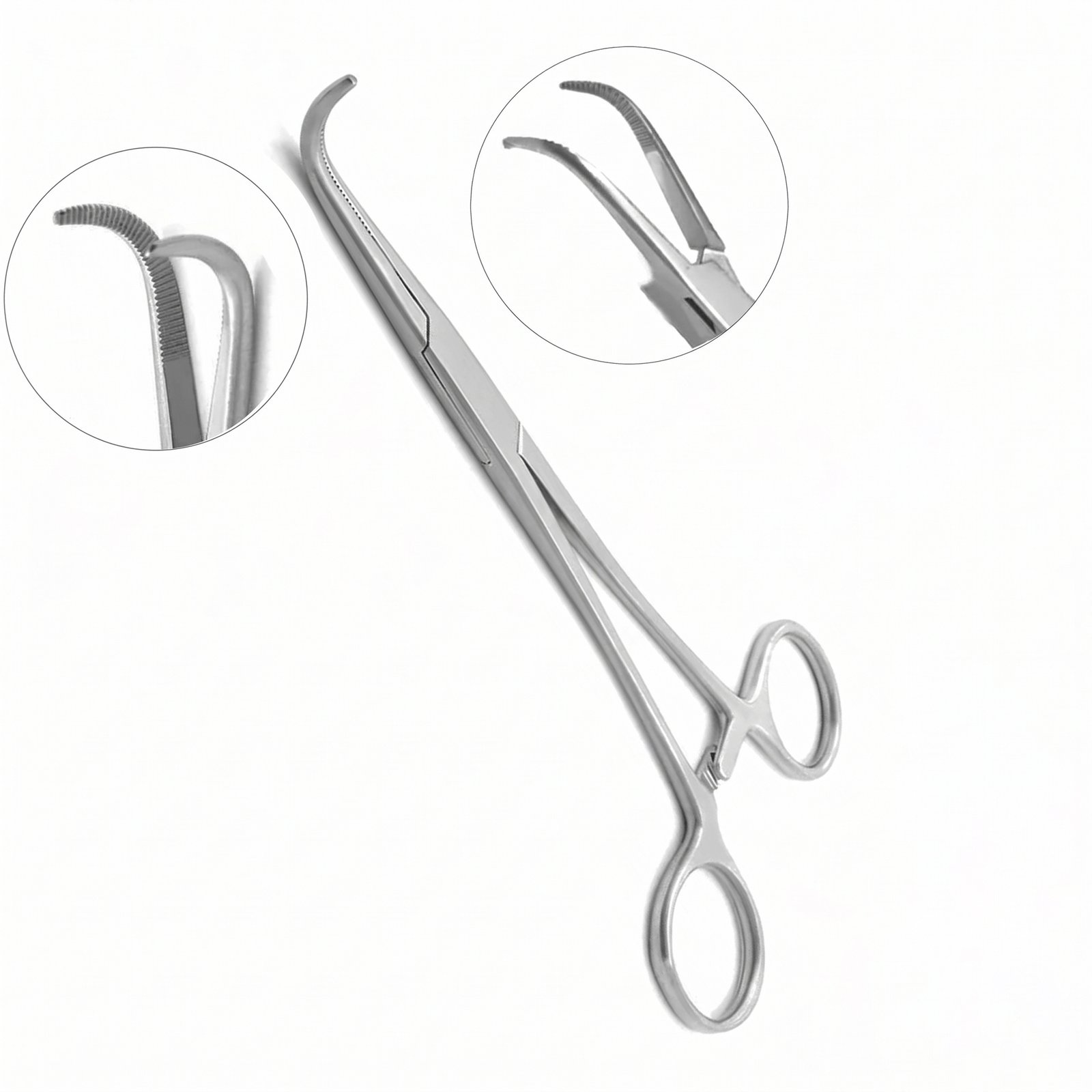 This instrument features fully curved, right-angled serrated jaws, allowing for effective navigation around deep tissues and vessels. The curved design enables surgeons to securely clamp blood vessels, control bleeding, and pass ligatures with enhanced accuracy, even in confined or hard-to-access surgical fields.