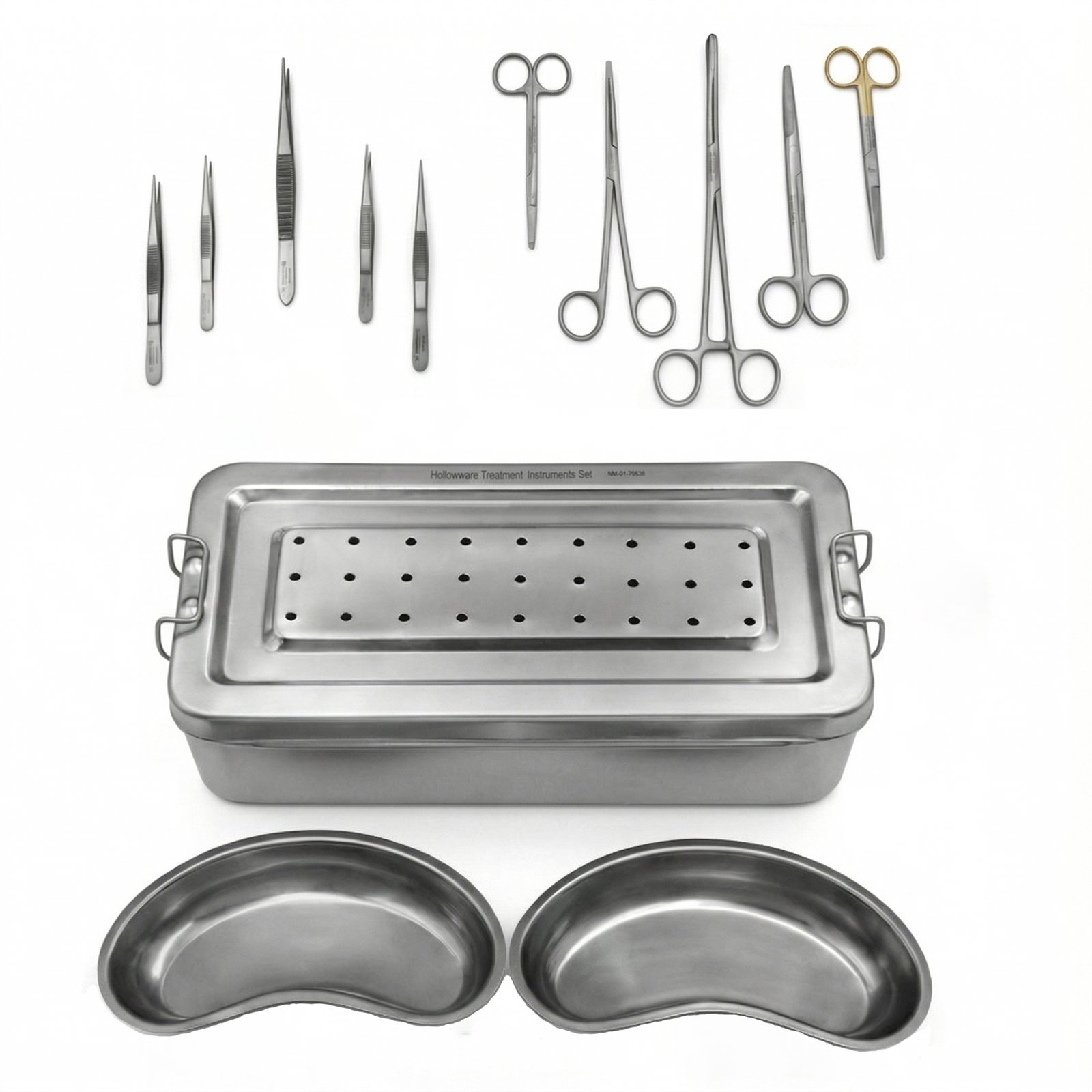 Carefully engineered to enhance operational efficiency, this set includes essential forceps and scissors for handling tissues and materials, along with hollow ware components such as kidney dishes and instrument containers to maintain a sterile and organized surgical environment.